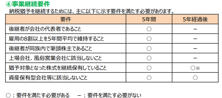 相続税・贈与税ともに納税猶予を継続するための事業要件は以下の通りです。