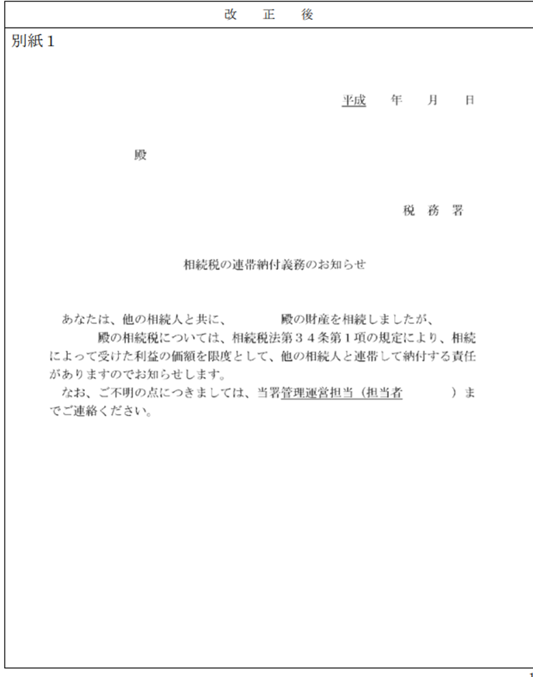 内部事務一元化全署実施により、2009年(平成21年)7月10日に「相続税法第34条に規定する連帯納付の義務に係る通知等について」(法令解釈通達)の一部が、以下のように改正されました。
